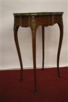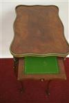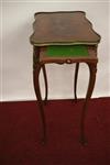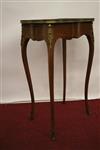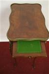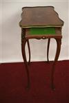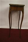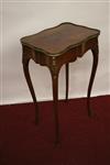 LOUIS XV STYLE FRENCH BRASS-MOUNTED WALNUT PETITE SIDE TABLE , late 19th century. Rectangular top with serpentine outline and brass banding over apron fitted with end drawer opposed by teapot slide. - H: 27 in.; top, 10 3/4 in. x 15 3/8 in. Estimate $125-175