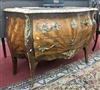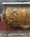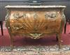 LOUIS XV STYLE PARQUETRY INLAID TWO-DRAWER BOMBE COMMODE WITH MOTTLED MARBLE-TOP. Cream, brown and aubergine molded marble-top with serpentine edge projects over two drawers with cast leafy pulls, cartouche-shape escutcheons, corner mounts and sabots H: 34 in.; W; 47 in.; D. 22in. Estimate $200-300