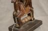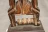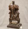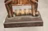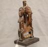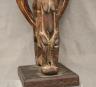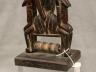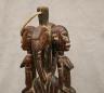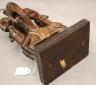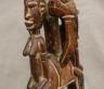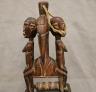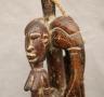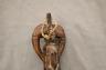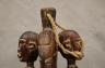 MALIAN DOGON WITH BACK-TO-BACK SEATED HUMANS HEDDLE PULLEY This Malian heddle pulley, likely originating from the Dogon or Bamana people, is a functional yet highly symbolic object used in traditional horizontal strip-weaving. Carved from a single block of dark, weathered wood, the pulley is surmounted by two seated human figures positioned back-to-back, a design that likely represents ancestral spirits or the duality of social life. The figures exhibit classic Sudanese sculptural traits, including slender limbs, pointed breasts, and serene facial expressions with high, arched foreheads and linear scarification on the arms. Between the figures, the central frame features geometric incised patterns and a small wooden roller at the base, which allowed the weaver to smoothly manipulate the warp threads. In Malian culture, weaving is often viewed as a metaphorical act of "speaking" or creation, and these ornate pulleys served to bring spiritual protection and aesthetic harmony to the weaver's workspace. $150-250