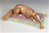 MEISSEN PORCELAIN FIGURE OF WHIPPET "ZEMIRE", FAVORITE DOG OF CATHERINE II, 19th century, after a model by J.J. Kaendler. Dog recumbent on green cushion with yellow tassels; blue crossed swords mark - L: 17 in.; W: 9 3/4 in. Estimate $800-1,000 CF: Deborah, Duchess of Devonshire, Chatsworth, The House, London, 2002, pp.176-177. The Duchess writes 'On it [the piano] sits... the Meissen models of the Empress of Russia's dog, a good old mongrel on a grand china cushion'. Damaged, repaired and repainted Please note photos of damage and repairs.
