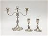 MEXICAN STERLING SILVER THREE-LIGHT CANDELABRA AND PAIR SMALL CANDLESTICKS WITH DOLPHIN-FORM SUPPORTS. Candelabra, H: 11 in. Wt. 39.2 troy oz. Property from the Estate of Erich G. Holzapfel, Washington, DCEstimate $500-700