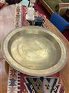 MID-EASTERN BRASS CIRCULAR DISH-TOP TABLE RAISED ON THREE SHAPED LEGS. Top, D: 33 1/2 in.Estimate $150-200