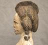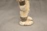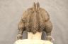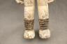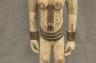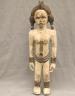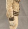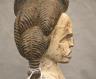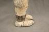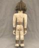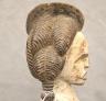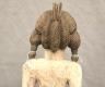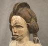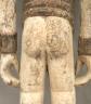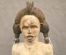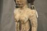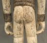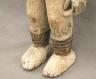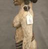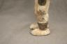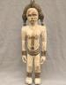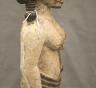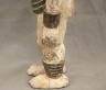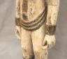 NIGERIAN IGBO ALUSI SHRINE FIGURE This Igbo Alusi shrine figure from Nigeria is a powerful sculptural representation of a tutelary deity or spirit, serving as an intermediary between the human community and the divine. Carved from wood and heavily coated in kaolin (white clay) pigment, the figure symbolizes spiritual purity, the realm of the ancestors, and the benevolent light of the sun. The standing female figure is characterized by a formal, upright posture with arms held slightly away from the body, emphasizing her presence and authority within a village shrine. Notable details include the intricate three-part coiffure and the raised, geometric scarification patterns (ichi) on the torso and abdomen, which denote high title, refined character, and social identity within Igbo society. Adorned with carved bangles and anklets, such figures were traditionally commissioned to ensure community protection, fertility, and agricultural success, acting as a physical home for the spirit they represent. Height: 24 inches $120-150