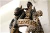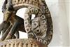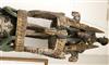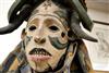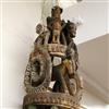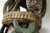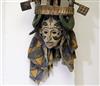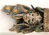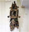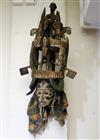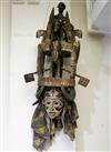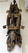 NIGERIAN IGBO PEOPLES MAIDEN SPIRIT HELMET MASK, circa 1900. Igbo Peoples, Southeast Nigeria, Agbogho Mmuo or Maiden Spirit Mask surmounted by elaborate arrangement of oxen, snakes, leopard, man on horseback and guardians. Hand-carved and painted wood with old and newer fabric cowling. From a single section of softwood log. 39" tall, 12" diam. Some losses, signs of use. - height: 47 inches. Estimate $600-1,200