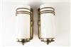 PAIR ART DECO STYLE BRASS SINGLE-LIGHT WALL SCONCES WITH MILK GLASS CYLINDRICAL SHADES. Brass geometric backplates - H: 9 5/8 in.Estimate $150-250