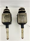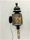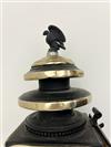 PAIR 19TH CENTURY BLACK-PAINTED METAL AND BRASS COACH LAMPS. Eagle-form finials. H: 25 1/2 in. 20th century electrification.Estimate $150-250