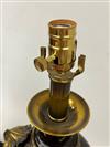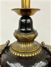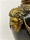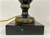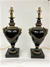 PAIR CONTINENTAL BLACK MARBLE COVERED URN-FORM TABLE LAMPS WITH GILT METAL SWAG DECORATION AND MASK HANDLES. Pedestal bases rest on square black marble plinths - Bases, excluding lamp fittings, H: 22 1/2 in.Estimate $250-350