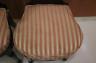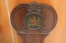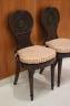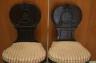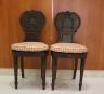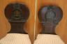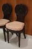 PAIR ENGLISH CARVED MAHOGANY HALL CHAIRS 19th century Rounded backs carved with double scrolls centering finely painted armorial of lion and unicorn flanking crown and shield; balloon shape seats with tie-on striped silk seat cushions $300-400