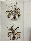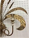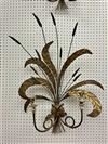 PAIR GILT-METAL AND WOOD TWO-LIGHT WALL SCONCES. Scrolling leaves and wheat above two scrolling arms terminating in painted wooden candle nozzles - H: 35 in.Estimate $300-400