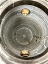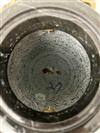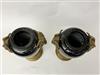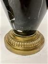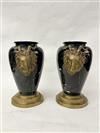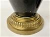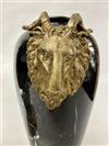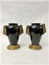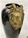 PAIR OF CARVED BLACK MARBLE URNS WITH GILT BRONZE RAM'S HEAD HANDLES. Circular bronze bases. One repaired - H: 12 1/4 in.Estimate $200-300