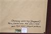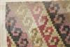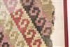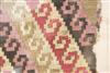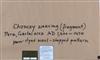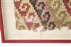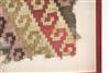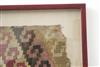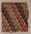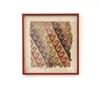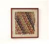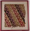 PRE-COLUMBIAN TEXTILE CHANCAY WEAVED FRAMED FRAGMENT, This framed ancient Peruvian textile fragment, specifically a slit-tapestry weaving from the Chancay cultures of Peru's Central Coast. The design features diagonal stripes containing repeating geometric motifs known as step-volutes, meanders, and stepped hooks. Typically dating to the Late Intermediate Period (approximately 1000–1476 CE), these fragments were woven using cotton warps and camelid wool wefts, such as alpaca or llama, utilizing a slit-tapestry technique where gaps are left between different colored sections. Framed. Not examined out of frame. $500-700