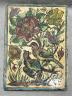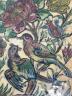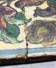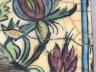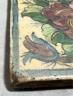 Persian Qajar-style ceramic tile 19th century Patinated and repaired ceramic tile is an example of Qajar-style artistry from Iran, likely dating to the 19th or early 20th century. It features the classic "Gol-o-Bolbol" (Rose and Nightingale) motif, a cherished theme in Persian literature and decorative arts where the bird represents the lover and the flower represents the beloved. The composition shows two birds—one perched and one appearing to land—amidst a dense arrangement of vibrant, multi-petaled roses and smaller blossoms in shades of red, yellow, and blue. The entire scene is framed by a simple turquoise-blue border, and the cream-colored background is marked by a heavy crackle glaze (craquelure), which is a characteristic finish for tiles of this period. 13 x 9.5 inches $150-250