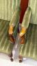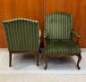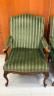 QUEEN ANNE STYLE CARVED OAK, UPHOLSTERED OPEN-ARM CHAIRS Domed backs, arm rests and seats covered in green tone-on-tone striped velveteen; brass nail-head trim; cabriole legs. $250-350
