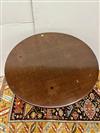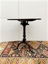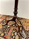 QUEEN ANNE STYLE CARVED MAHOGANY TILT-TOP TEA TABLE. Plain circular top over ring-and-urn turned base raised on three cabriole legs H: 27 in.; top, D: 26 3/4 in.Estimate $100-150