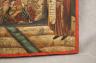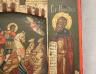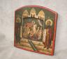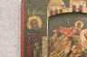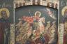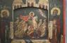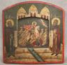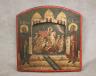 RUSSIAN ICON DEPICTING SAINT GEORGE SLAYING THE DRAGON Domed wooden panel; two saints flank central scene 11 3/4 in. x 11 3/4 in. $200-300