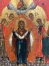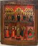 RUSSIAN ORTHODOX ICON OF THE POKROV MOTHER OF GOD Hand painted in egg tempera, gold leaf, and gesso on wood. This icon commemorates the feast of the Protecting Veil or Pokrov which originated in Russia, when pilgrims visited the Constantinople Church of the Blachernae, the location where the veil of the Virgin was kept. 11 in. x 13 3/4 in. $200-300