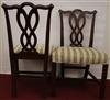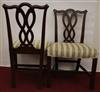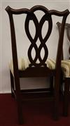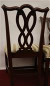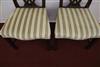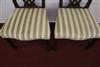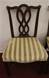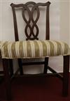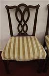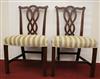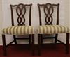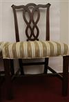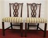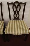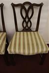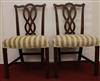 SET EIGHT CHIPPENDALE STYLE CARVED MAHOGANY DINING SIDECHAIRS. Backs have serpentine crests over interlaced splats; molded square legs joined by box stretcher; seats covered in plush striped upholstery.Estimate $350-500
