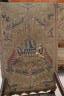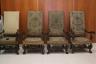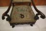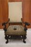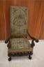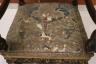 SET FOUR CONTINENTAL RENAISSANCE STYLE CARVED WALNUT OPEN-ARM CHAIRS WITH 18TH CENTURY NEEDLEWORK TAPESTRY 19th century High squared backs; shaped arms with carved handholds; legs with scrolling front feet joined by turned H-stretchers; upholstery with Egyptian mask and pavilion motifs. $1,000-1,500