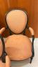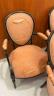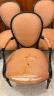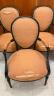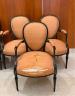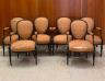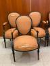 SET OF SIX LOUIS XVI BLACK-PAINTED OPEN-ARM CHAIRS WITH PEACH COLOR FABRIC UPHOLSTERED OVOID BACK PANELS, SEATS AND ARM RESTS (Imperfections). $200-300