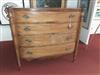 SHERATON MAHOGANY FOUR-DRAWER BOWFRONT CHEST. Turret corners over ring-turned corner columns; four cockbeaded drawers with brass oval pulls H: 40 1/2 in.; W: 43 in.; D: 19 3/4 in.Estimate $150-250 Imperfections