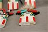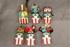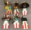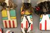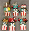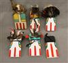 SIX SIGNED TED PUHUYESVA HOPI ARTIST SIGNED WUKOQOTE (BIG HEAD) CRADLE KACHINA DOLLS. Artist: TED PUHUYESVA. Six painted wooden Kachina dolls (or Katsina dolls) which are traditional ceremonial objects made by the Hopi people and other Pueblo tribes of the American Southwest, such as the Zuni and Tewa. They are representations of the Kachinas (spiritual beings who represent elements of the natural world, ancestors, or specific ceremonial figures) and are given to children (especially girls) as gifts to educate them about the spirit world and their religious traditions, not as actual toys. They are characterized by their simplified, blocky wooden bodies and heads, elaborate painting, and details like feathers, yarn, and natural fibers attached to the head.