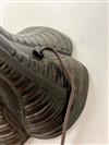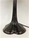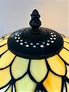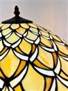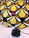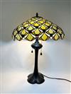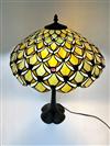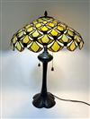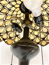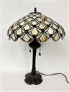 SLAG ART GLASS TWO-LIGHT TABLE LAMP WITH FISH-SCALE PATTERN DOMED SHADE. Cream. light brown and light blue shade tiled with cabochon jewel enhancements; patinated bronze base. H: 26 in.; shade: D: 17 in.Estimate $250-350