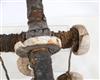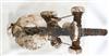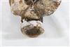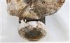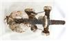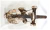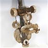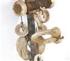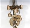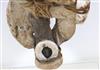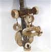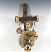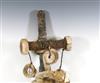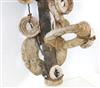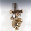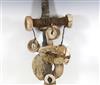 SOLOMON ISLANDS WESTERN PROVINCE BOAT PROTECTOR, Mid-to-late 20th century. Unique and rare boat protector probably made for a Tomako or a Lisi which is are large canoes from the Solomon Islands. Such boats are usually decorated with fringes of cowrie shells, nautilus shells, and mother-of-pearl including the present lot. When acquired, consignor was told it is named "linkoma" which is a "boat protector." Consignor acquired this item when working in the Solomon Islands. - Height: 15 inches. Estimate $200-250