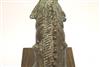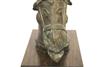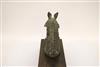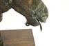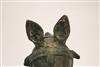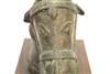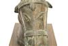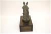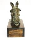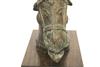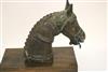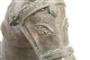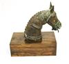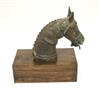 SOUTH INDIAN BRASS HORSE HEAD BELONGING TO A VAHANA, Late 19th century. (Vahana is the vehicle of Shiva in the Madrai veeran pose).Movable tongue. Presented on purpose made wooden base. Acquired it in India in 1980s. - Height bronze bust: 10 inches; Artifact with stand: 14.25 inches. Estimate $125-175