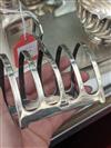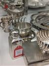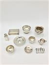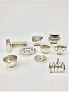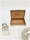 TEN ENGLISH SILVER TABLE ARTICLES AND OTHER SMALL ITEMS. Including wood-lined cigarette box, toast rack, miniature toasting cup, flask, and small bowl and ashtrays. Cigarette box, 5 5/8 in. x 3 1/2 in. Gross wt. 43.6 troy oz. Property from the Estate of Erich G. Holzapfel, Washington, DC Estimate $400-600