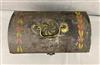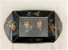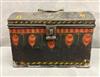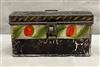 THREE ITEMS AMERICAN PAINTED TOLEWARE, 19th century. Including dome top box with original painted decoration and brass handle,, inscribed on back "Ann B Voorhees New Brunswick NJ" presumably the original owner; (probably Ann Voorhees (1794-1837) married to Israel Freeman) H: 6 1/4 in. W: 9 1/4 in.; toleware documents box, 8 1/8 in. x 3 1/2 in. and handpainted tole tray with raised lip, circa 1870 $200-300