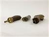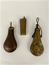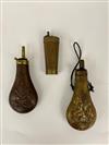 THREE 19TH CENTURY GUNPOWDER FLASKS. Two drop-shape with relief decoration. Largest, L: 8 in.Estimate $100-150