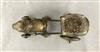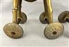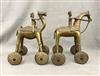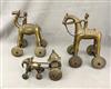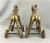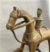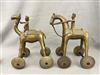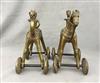 THREE ANTIQUE INDIAN CAST BRASS PULL TOYS. Two, figures on horseback, H: 13 in. One, figure on elephant pulling covered cart
