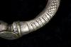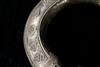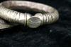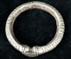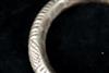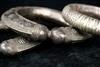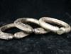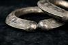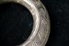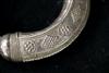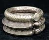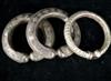 THREE CENTRAL ASIAN TRIBAL ANKLE BRACELETS. Set of three ornate ankle bracelets, often referred to as "anklets," "anklets," or "payal" in South Asian cultures. They lack a hinge or openable closure. The surface of the bracelets is heavily decorated with repoussé, chasing, or stamping. The patterns vary on each piece, including geometric shapes like diamonds, dots, and intricate horizontal lines.Given the decorative motifs they are characteristic of traditional Indian or Pakistani tribal jewelry. $120-160