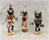 THREE KACHINA DOLLS FROM PUEBLO NATIVE TRIBES PRIMARILY THE HOPI AND ZUNI. Set of three Kachina Dolls (or Katsina dolls or Qatsina dolls) from the Pueblo Native tribes primarily the Hopi and Zuni. They are carved decorated figures that represent the spiritual beings, or Kachinas (Katsinam), who act as messengers between humans and the gods. Traditionally, these dolls are carved by male family members (usually from cottonwood root) and given to young girls and new brides to educate them about the hundreds of different Kachinas, their masks, and their ceremonial functions. The dolls represent spirit beings who control natural forces like rain, fertility, and harvests, and who also serve as moral guides and disciplinarians.