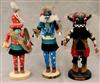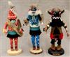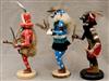 THREE KACHINA DOLLS FROM PUEBLO NATIVE TRIBES PRIMARILY THE HOPI AND ZUNI. Set of three Kachina Dolls (or Katsina dolls or Qatsina dolls) from the Pueblo Native tribes primarily the Hopi and Zuni. They are carved decorated figures that represent the spiritual beings, or Kachinas (Katsinam), who act as messengers between humans and the gods. Traditionally, these dolls are carved by male family members (usually from cottonwood root) and given to young girls and new brides to educate them about the hundreds of different Kachinas, their masks, and their ceremonial functions. The dolls represent spirit beings who control natural forces like rain, fertility, and harvests, and who also serve as moral guides and disciplinarians.