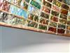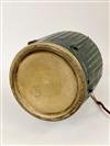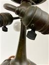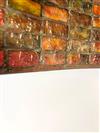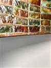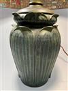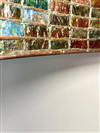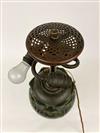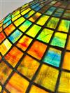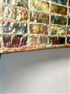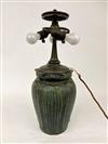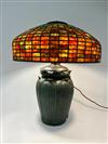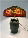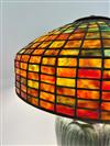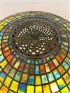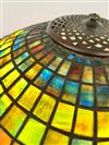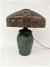 THREE-LIGHT ART GLASS TABLE LAMP AFTER TIFFANY STUDIOS. Domed shade with various color slag glass tiles. Faience base. Shade and base each spuriously signed. Overall, H: 23 in.; shade, D: 18 in.Estimate $500-1,000