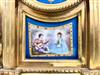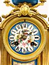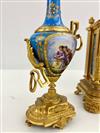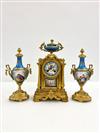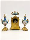 THREE PIECE ASSEMBLED LATE 19TH CENTURY SEVRES STYLE GILT BRONZE AND ENAMELED PORCELAIN CLOCK GARNITURE. Including; mantel clock, and urn form finial, and pair similar mantel urns. Each has celeste blue porcelain panels with hand-painted reserves of romantic figures in landscape and floral decoration; gilt accents. Clock, H: 3 1/2". Estimate $400-600