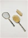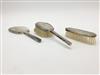 THREE-PIECE ENGLISH SILVER DRESSER SET. Made Birmingham. Including paddle-form hand mirror, hair brush and clothes brush. Engine-turned wrigglework decoration. Mirror, L: 11 in. Property from the Estate of Erich G. Holzapfel, Washington, DC Estimate $100-150