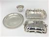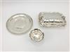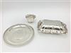 THREE PIECES CARTIER STERLING SILVER HOLLOWARE, mid-to-late 20th century. Shaped oblong vegetable dish, circular serving plate, and footed shaped bowl. Vegetable dish, 11 1/2 in. x 8 in. Wt. 41.8 troy oz. Property from the Estate of Erich G. Holzapfel, Washington, DC Estimate $600-800