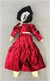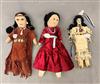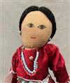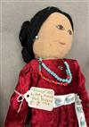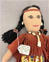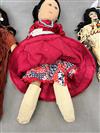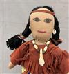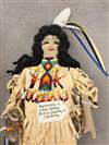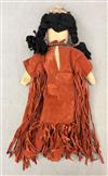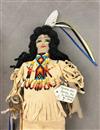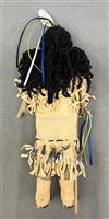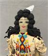 THREE PLAINS OR SOUTHWESTERN NATIVE AMERICAN FOLK ART DOLLS. Set of three Plains or Southwestern Native American Folk Art Dolls. The dolls have soft bodies, which is a common and enduring style of Native American folk art doll-making across many tribes (e.g., Sioux, Navajo, Pueblo, Cheyenne). Their dresses are made of a light brown material that resembles suede or buckskin (often actual leather, suede cloth, or felt on modern collectible dolls). All the dolls are adorned with beadwork. Lastly, the dolls feature long, braided black yarn or synthetic fiber hair, often parted down the middle and held in place by a beaded headband. - Height: (approx): 16.5 inches. $120-250