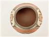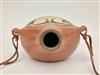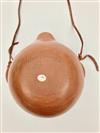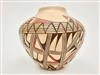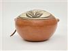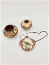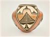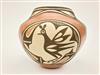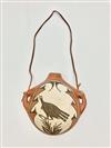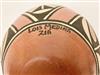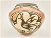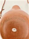 THREE SOUTHWEST-INDIAN-AMERICAN SIGNED POLYCHROMED CLAY VESELS: VENORA SILAS , LOIS MEDINA, AND HELEN GACHUPIN. Three vesels. (1) Smallest Hopi style pottery vase / bowl is signed "Venora Silas Hopi Tewa" (5.5 height; 6 in. diameter); (2) large handmade water jar Zia Pueblo pottery signed "Lois Medina Zia" (American, born 1959, 6 x 6 inches); and (3) a pottery water flask with a leather strap signed "Helen Gachupin 21 F" (American, 1931 - 1999, 7 x 4 inches). All in good condition. Estimate $700-900
