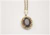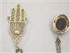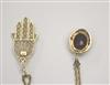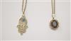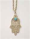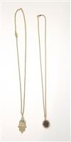 TWO 14K YELOW GOLD PENDANTS ON GOLD CHAINS. One, oval, with four round diamonds centering oval synthetic ruby; one gold filigree "Good luck Hansa" hand pendant with round turquoise cabochon accent. 14K yellow gold pendant chains, L; 16 in. Gross wt. app. 4 dwt Estimate $150-250
