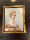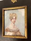TWO 19TH CENTURY PAINTED PORTRAIT MINIATURES OF LADIES. One, signed "Pardon" of subject with elaborate headpiece, 3 1/2 in. x 2 3/4 in. Other, early Victorian subject with ringlets, wearing coral color dress, 3 in. x 2 5/8 in. Estimate $200-300