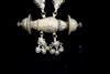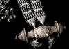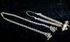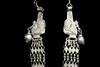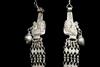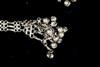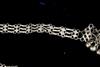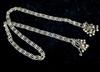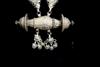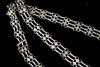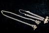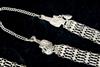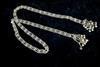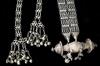 TWO CENTRAL ASIAN TRIBAL NECKLACES . Set of two necklaces (one could be worn as a belts) which are often found in the jewelry traditions of regions like Rajasthan, Gujarat, and other parts of Western and Central India. Both are made of a series of intricate, interconnected filigree or open-work links forming a continuous, repeating pattern. At one end, there is a cluster of small bell-like charms. The necklace features a large, ornate pendant that appears to be a stylized animal or deity. $150-200