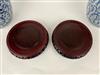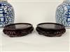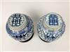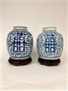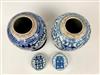 TWO CHINESE BLUE AND WHITE PORCELAIN GINGER JARS WITH LIFT COVERS. Character motifs centered by trailing vines; teakwood stands. - Jars, H: 10".Estimate $150-250