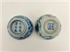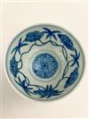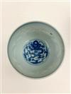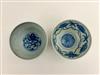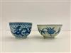 TWO CHINESE BLUE AND WHITE PORCELAIN RING-FOOTED BOWLS. One, decorated with trailing, flowering vine, D: 3 3/8"; other, with five-toed dragons, D: 3". Each has six-character mark under foot.Estimate $125-175