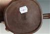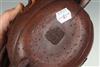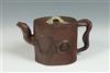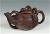 TWO CHINESE BROWN POTTERY YIXING TEAPOTS. First, fully sculpted leaf and vine decoration. Signed on base; H: 5 in. Second, with colorful glaze to lid, H: 3 1/2 in. Estimate $80-100