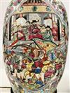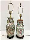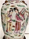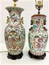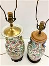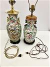 TWO CHINESE FAMILLE ROSE PORCELAIN BALUSTER-FORM TWO-HANDLE VASES MOUNTED AS TABLE LAMPS. Each enameled with figural decoration; carved teakwood stands - Taller vessel, H: 17 in.Estimate $200-300