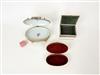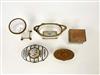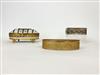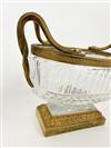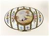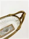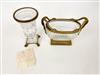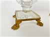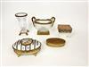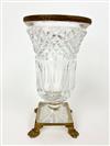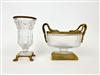 TWO CONTINENTAL GILT-METAL-MOUNTED CUT CRYSTAL PEDESTAL-BASE VASES, FLORAL-PAINTED PORCELAIN OVAL JEWELRY BOX, AND TWO TRINKET BOXES WITH ENGRAVED COPPER-PLATE INSET TOPS. - Largest, L: 8 in.Estimate $300-400