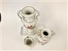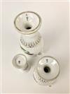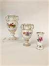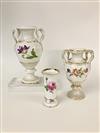 TWO GRADUATED MEISSEN POLYCHROMED PORCELAIN PEDESTAL-BASE VASES AND A CYLINDRICAL VASE. With floral decoration and gilt accents; urn form vases have coiled serpent handles. - Tallest, H: 11".Estimate $300-400
